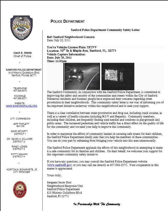 Sanford police said Monday that letters will only be generated when an officer is confident the driver is circling the block looking for a prostitute, and not, for example, driving around lost.