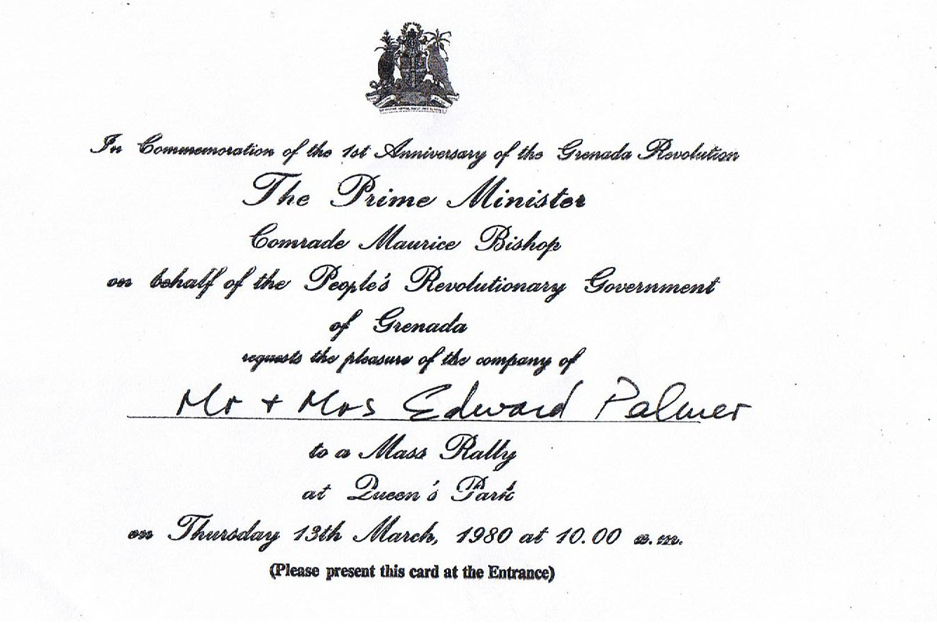 In 1980, Buzz Palmer and Alice Palmer were invited by the Maurice Bishop led government of the Caribbean island of Grenada, to attend celebrations marking the first anniversary of the country's Cuban/Soviet backed "revolution". A revolution overturned by US troops three years later.