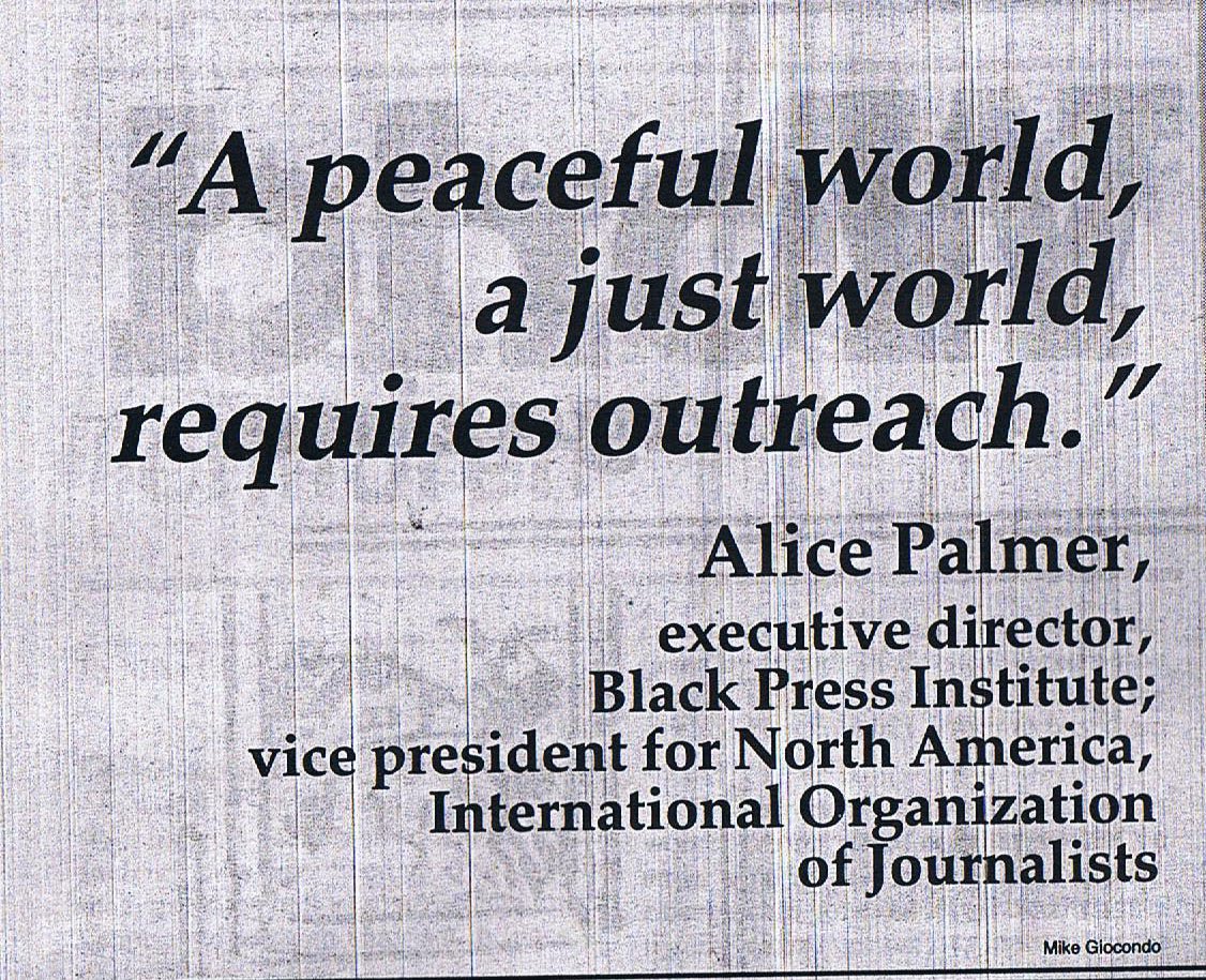 Alice Palmer, as editor of the Black Press Review, was elected International Organization of Journalists vice president for North America, at the organization's 10th Congress, October 20-23 1986, in Prague Czechoslovakia. Palmer's IOJ duties were to include co-ordinating the activities of chapters in the US, Canada,
