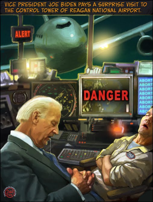 Lunchbucket Joe, laser-focused on jobs, rolls up his hypothetical sleeves to pitch in as an air traffic controller for a night. It's reported that as the VP drifted off he gaffed, "Hey man, all these blinky lights are almost as f#@*ing hypnotic as one of Obama's rambling zzzzzzzzzz."