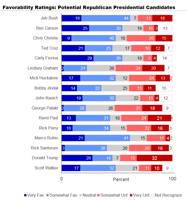 Trump is leading by a bit, followed by Jeb and surprisingly by Kasich and Cruz.  Kasich certainly showed more charisma at the debate than Jeb, I wonder if there is a chance that the establishment decides to go with him instead at some point?  Walker's support has completely collapsed and Paul's has also gone down dramatically.  Carly Fiorina had a nice jump and also looks like she has very high favorables with very few people hating her: