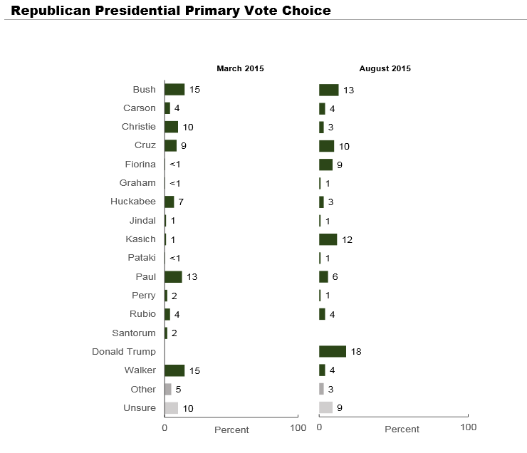 Carson, Fiorina, Kasich and Rubio all have very low very unfavorables.  Trump on the other hand has more people that hate him than love him, which I hope means he can't go up much further in the polls.  The following chart though really helps cement the idea not to trust any of these polls at this point, at least on voter preference: