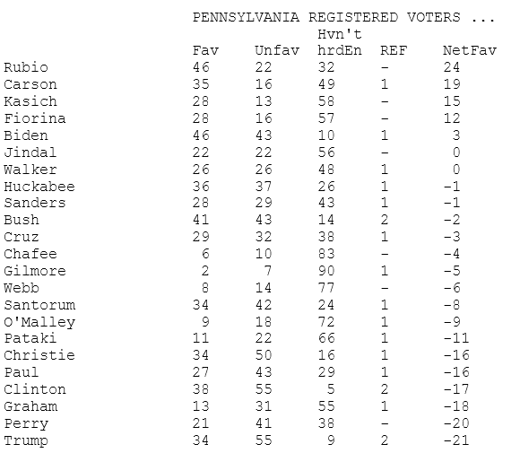 The Quinnipiac poll of battle ground states had some pretty interesting information in it. Most notably, amongst registered voters of all political stripes, the top 4 names are the same in each of the states polled (Florida, Ohio and Pennsylvania). The four are Rubio, Kasich, Fiorina and Carson, who seem to run the gambit of the GOP, from moderate (Kasich) to establishment conservative (Rubio) and full-on Tea Party outsider (Carson). And all of them have better numbers than both Clinton and Biden.