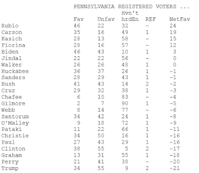 Also, I think we are at the point where we need to consider that Hillary might night be the nominee and Biden might be. Unlike Hillary who has enormously negative net favorability in all three states, Biden is slightly positive, making him an even tougher target. Having Trump, who is so disliked by the general population run against someone people are at least slightly positive on, will probably not end well for the GOP. At this point it looks like Rubio, Kasich, Fiorina and Carson would be much better choices than Trump (though I don't think Carson is ready and Kasich might be too liberal for me) if we want to compete.