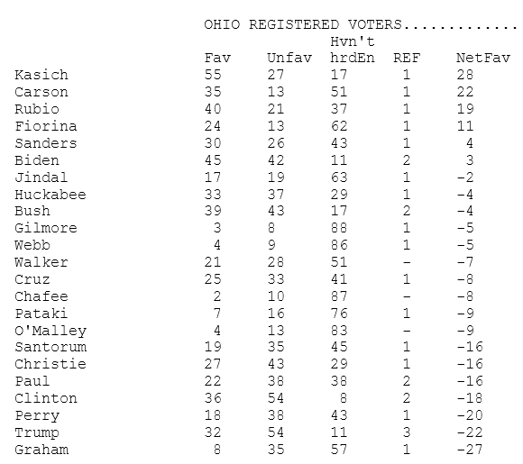 Not much of a shock that Kasich is on top here (though 17% of registered voters haven't heard of their own governor?). Again, Trump is doing abysmally, even worse than Hillary (which is probably why she beats him here (43 vs. 38).