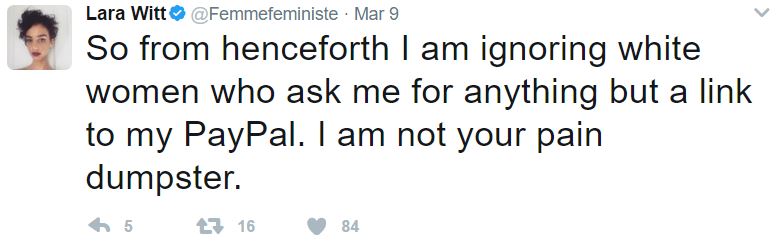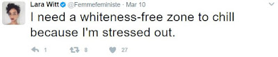This follows a number of racially-charged comments on Twitter, in which Ms. Witt wrote about people who are bi-racial, being a "pain dumpster" for white women, and wishing for a "whiteness-free zone" to relax: