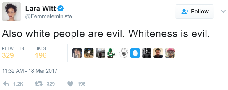 Social justice activist, Teen Vogue contributor, and self-described "Desi-Kenyan Feminist" Lara Witt declared on Saturday that "white people are evil" and "whiteness is evil." Her claims came on Twitter and follow a number of racially charged tweets that Witt has authored.