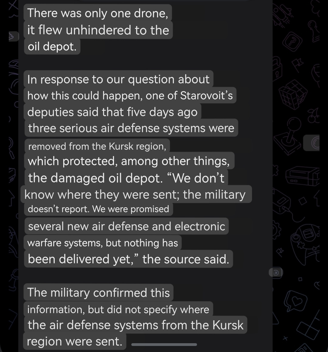 As previously reported, three tanks caught fire at an oil depot named 'Polevaya oil depot' near Kursk, after a drone attack last night. Two tanks were partially destroyed, emergency services reported. Meanwhile the open fire has been eliminated. The Governor of the Kursk region Roman Starovoyt thanked everyone who took part in the extinguishing for their work! But meanwhile questions rising. According to a report, there was only one drone, it flew unhindered to the oil depot and five days ago, three serious air defense systems were removed from the Kursk region, which protected, among other things, the damaged oil depot. But this isn't the tip of the iceberg. Apparently nobody knows where they are. 🤷♂️👀 The report also says that the military confirmed this information, but did not specify where the air defense systems from the Kursk region were sent. 👀 *unconfirmed, information cannot be independently verified