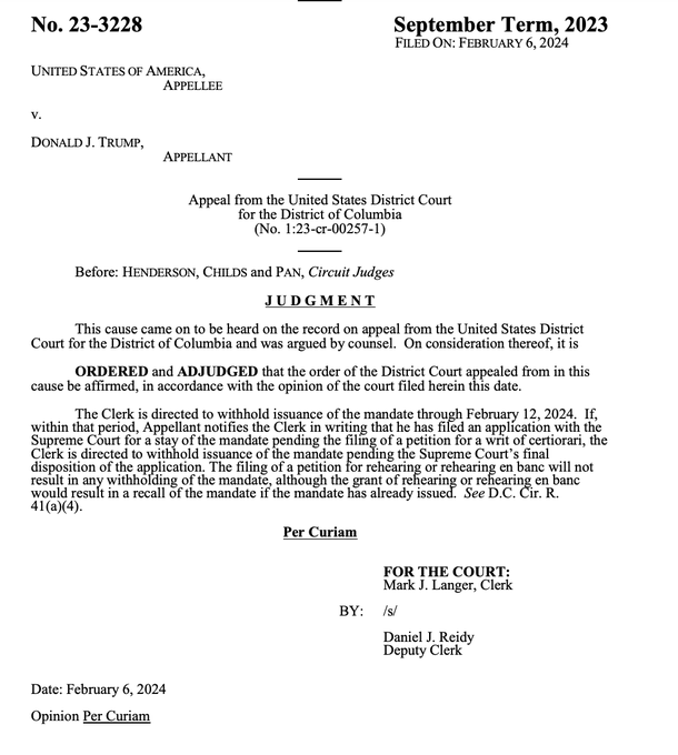 For the DC Circuit to rule Trump only gets until Monday, February 12th--instead of 90 days--to file proves this is very political. https://t.co/CZK76UoaNA— 🇺🇸 Mike Davis 🇺🇸 (@mrddmia) February 6, 2024
