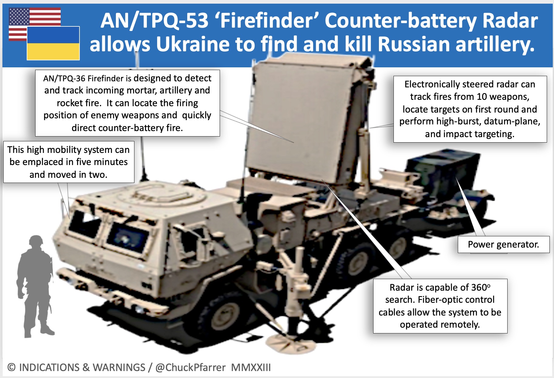COUNTER BATTERY KILLER: Russia loses, on average, 40-50 artillery pieces daily-- a full artillery battalion lost every day. One of the reasons is the AN/TPQ-36 Firefinder that can detect and track incoming mortar, artillery and rocket fire.