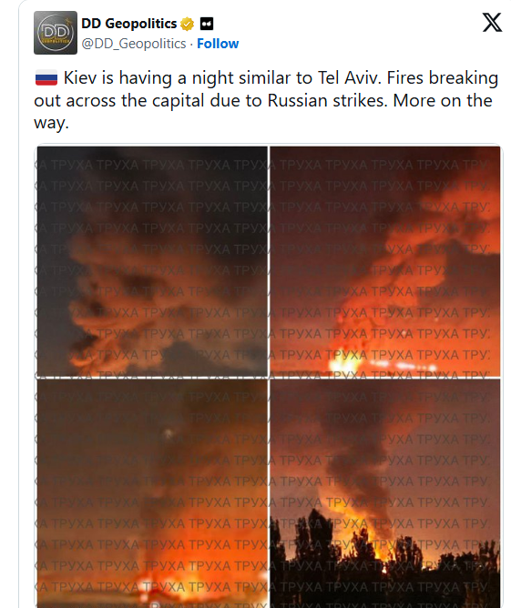 🇷🇺 Kiev is having a night similar to Tel Aviv. Fires breaking out across the capital due to Russian strikes. More on the way. pic.twitter.com/jOb8snw5DA— DD Geopolitics (@DD_Geopolitics) June 16, 2025
