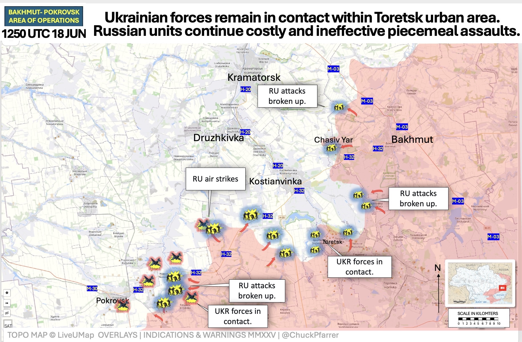 BAKHMUT- POKROVSK AO /1250 UTC 18 JUN/UKR forces remain in contact within Toretsk urban area.