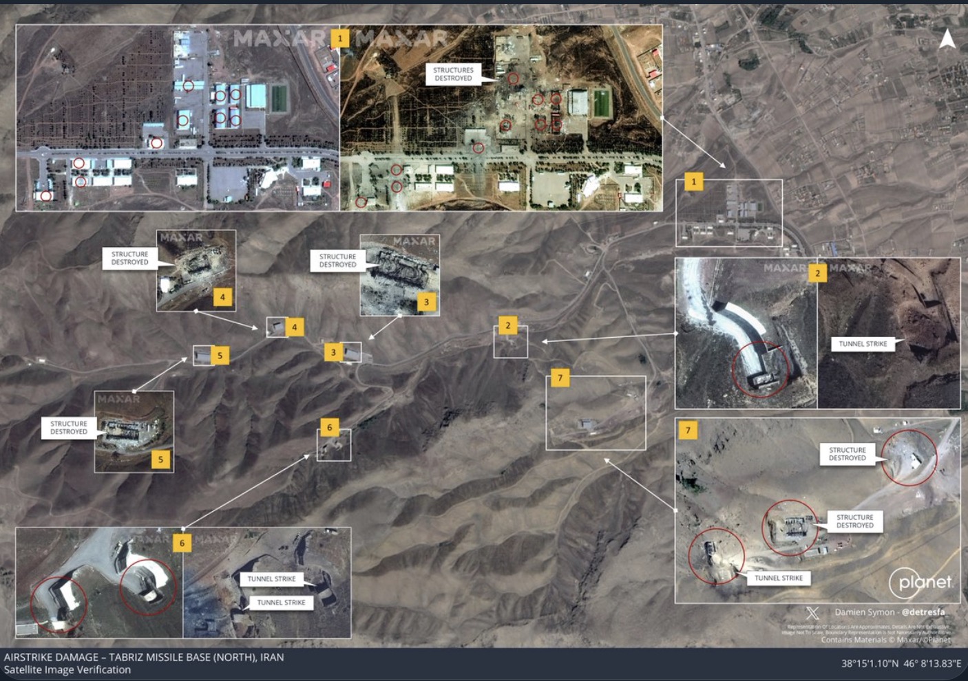 TARGET TABIZ: Maxar & Planet overhead imagery shows damage to Iran's Tabriz missile base. Note underground tunnel entrances have been interdicted. Access to the underground facility is blocked, but deeply buried assets remain.