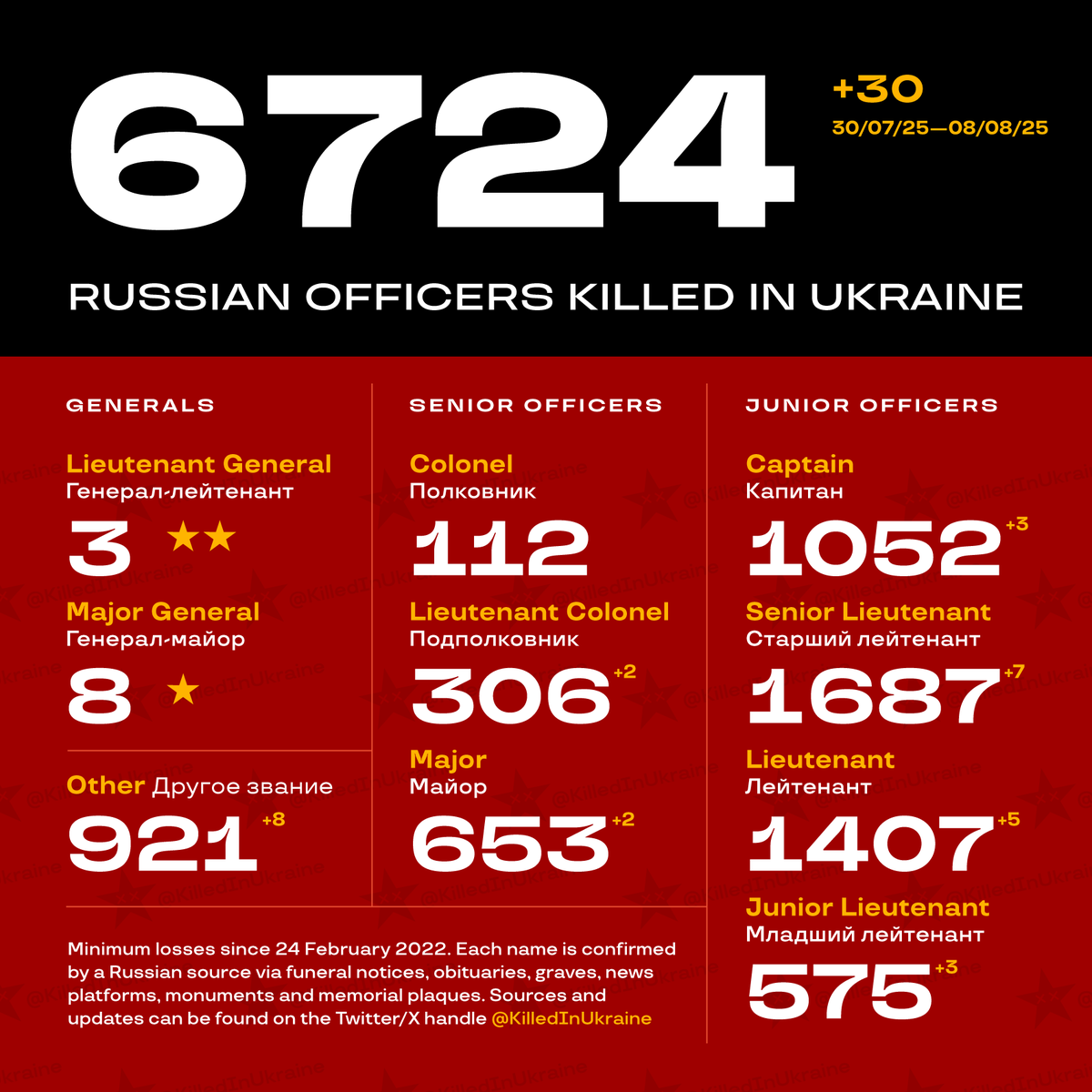 Russian sources confirm that at least 6 724 Russian officers were wiped out by the Armed Forces of Ukraine since 24 February 2022.