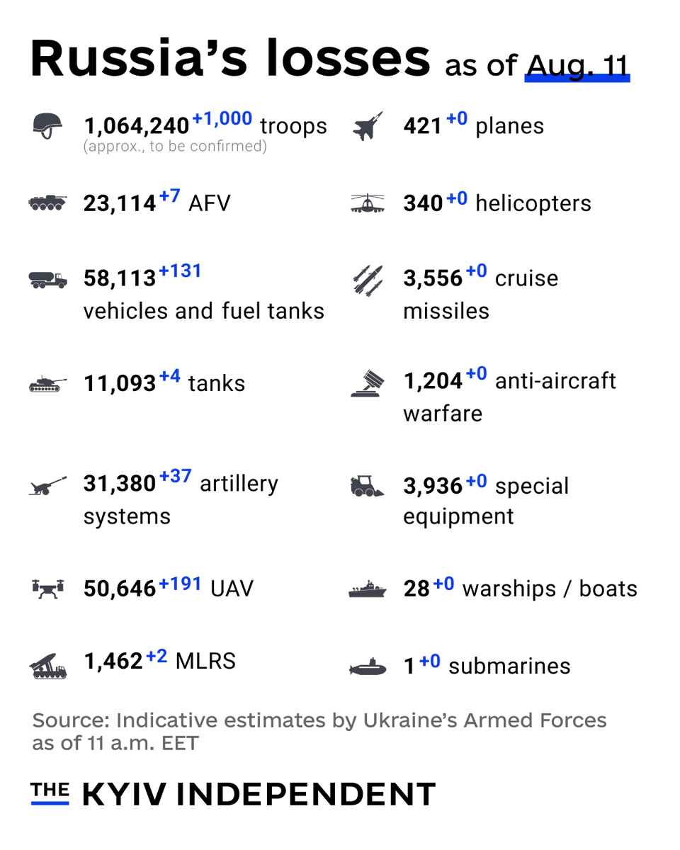 The Kremlin is attempting to use the upcoming Alaska summit to divide the United States from Europe rather than engage in meaningful peace efforts. Russian Security Council Deputy Chairperson Dmitry Medvedev claimed on August 10 on both his English and Russian language Telegram accounts that Europe is trying to prevent the United States from helping to stop the war in Ukraine.[8] Russian Liberal Democratic Party (LDPR) Head Leonid Slutsky claimed on August 9 that European countries are pursuing an anti-Russian policy and trying to prevent a quick peace settlement in Ukraine.[9] Russian political scientist Sergei Markov told the Washington Post on August 10 that Russia's main interest in the Alaska summit is to portray Ukraine and Europe rather than Russia as the obstacles to peace in Ukraine.[10] Markov stated that Russia refuses to take any steps backward and that the only compromise that Russia is willing to consider is halting military efforts to seize Odesa and Kharkiv oblasts and Kherson and Zaporizhzhia cities. Markov expressed hope that Trump will realize that Zelensky is the main reason for Russia's war in Ukraine and that European leaders are the second reason for the war, rather than Russia.