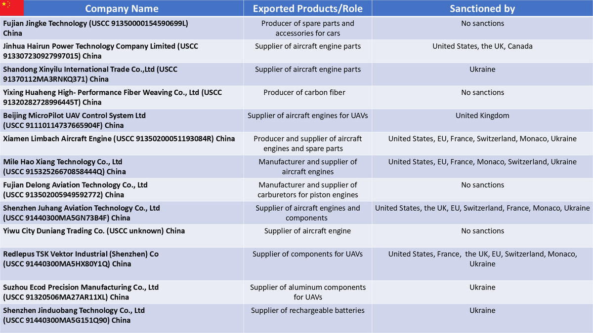 Tatarigami: China is reportedly ready to send peacekeepers to Ukraine, according to Welt am Sonntag, citing European diplomats. Meanwhile, Frontelligence Insight is releasing a list of Chinese companies involved in scaling Russia's Shahed drone program. Here is the list:
