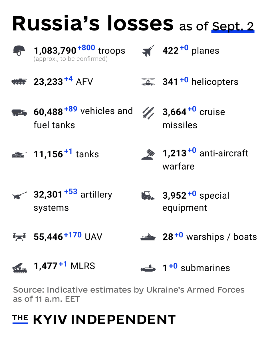 North Korea is reportedly planning to send about 6,000 more troops to Russia, likely to serve in supporting roles in the Russian rear. South Korea's Yonhap News Agency reported on September 2 that South Korea's National Intelligence Service (NIS) assessed to the South Korean Parliamentary Intelligence Committee that North Korea is planning to send roughly 6,000 additional soldiers to Russia and that roughly 1,000 North Korean military engineers have already arrived in Russia in the “rear front as reserve forces.”[13] Russian Security Council Secretary Sergei Shoigu announced on June 16 that North Korea would send 6,000 sappers and military engineers to help with reconstruction efforts in Kursk Oblast.[14] Ukrainian Main Military Intelligence Directorate (GUR) Deputy Chief Major General Vadym Skibitskyi reported on August 12 that North Korea had agreed to send additional troops to Russia to support reconstruction efforts in Kursk Oblast.[15] A Russian milblogger reportedly affiliated with the Russian Northern Grouping of Forces claimed on August 31 that North Korean sappers will soon operate in the Sudzha and Guyevo areas in Kursk Oblast and that Russian commanders received orders to prepare subordinates for the upcoming North Korean deployments to prevent friendly fire incidents or other “misunderstandings.”[16] The milblogger assessed that North Korean forces are unlikely to conduct combat operations against Ukraine and will likely conduct tasks in the rear, including serving as cooks and cleaners, to free up other Russian personnel for infantry assaults. ISW continues to assess that it is unclear whether North Korean troops will deploy to Ukrainian territory, which would mark a significant inflection, but that North Korean troops operating in Russian border areas would still allow more Russian forces to be deployed to the battlefield in Ukraine.[17]