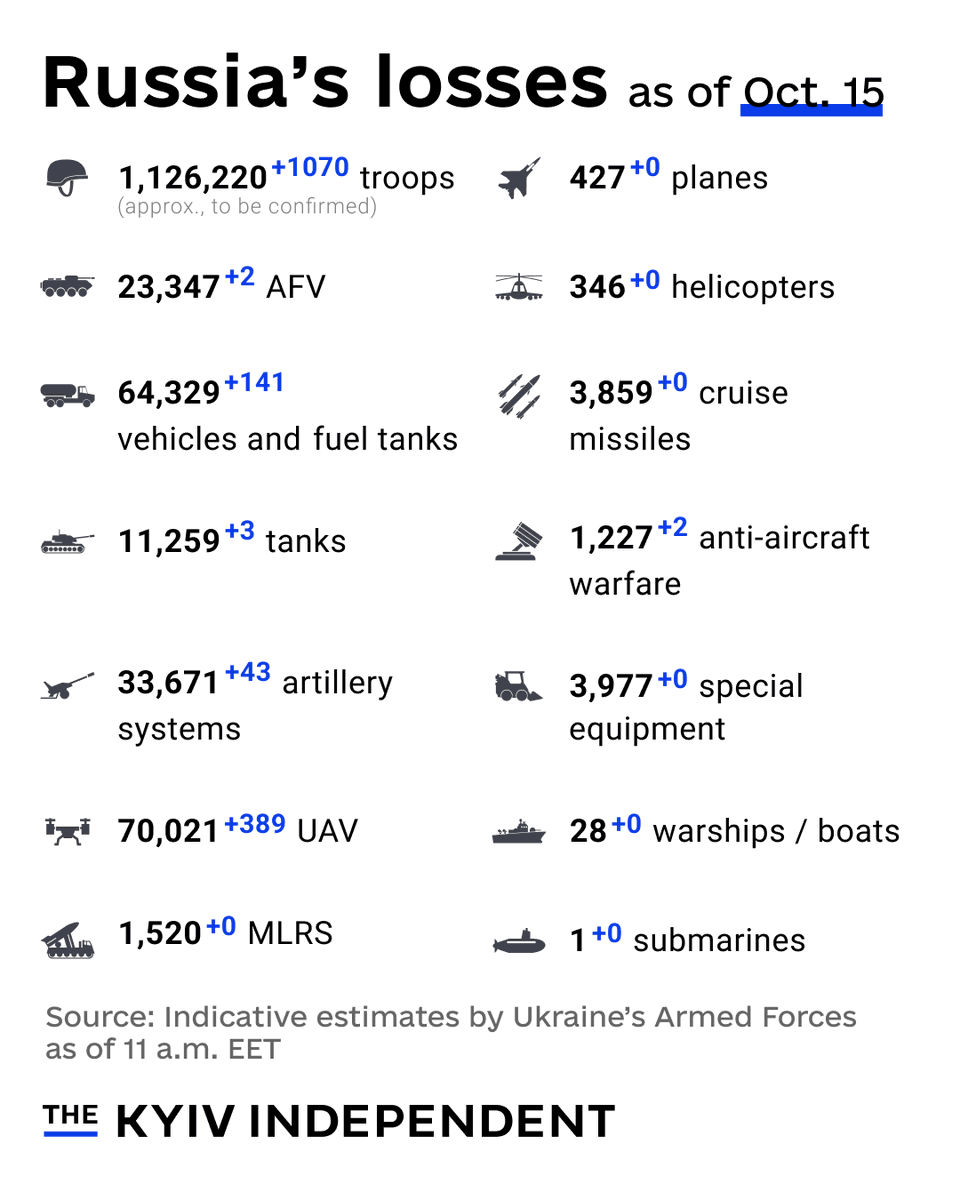 The Kremlin continues to demonstrate its unwillingness to compromise or engage in good-faith peace negotiations. Kremlin Spokesperson Dmitry Peskov stated on October 14 that Russia is ready for a peaceful settlement to the war in Ukraine but is continuing the war due to “lack of alternatives.”[16] Peskov claimed that Russia will ensure its interests in “one way or another” and achieve its war goals. The Kremlin has repeatedly defined its war aims as Ukrainian demilitarization, government change in favor of a pro-Russian proxy government, and Ukrainian commitments barring Ukraine from joining NATO and other international alliances.[17] Peskov’s statements are in line with boilerplate Kremlin rhetoric throughout the war and negotiations process that Russia will achieve these war aims either militarily or diplomatically.[18]