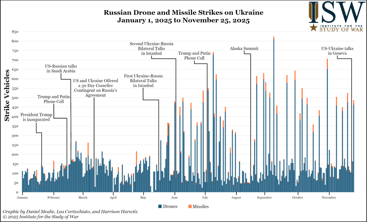 Russia killed at least seven Ukrainian civilians and injured at least 20 in Kyiv City and struck Ukrainian energy infrastructure during combined missile and drone strikes on the night of November 24 to 25. The Ukrainian Air Force reported that Russian forces launched 22 missiles and 464 Shahed-type, Gerbera-type, and other drones, and that 26 missiles and drones struck 15 locations and falling debris hit 12 locations.[19] The Ukrainian Air Force specified that Russian forces launched four Kh-47M2 Kinzhal aeroballistic missiles; three Iskander-M ballistic missiles; eight Kalibr and seven Iskander-K cruise missiles; and about 250 Shahed drones. The Ukrainian Air Force reported that Ukrainian forces downed one Kinzhal, three Iskander-M, five Iskander-K, and five Kalibr missiles and 438 drones. Ukrainian officials reported that Russian forces struck energy infrastructure in Kyiv City and Kyiv, Odesa, Chernihiv, Dnipropetrovsk, and Kharkiv oblasts; and stated that the government will impose rolling blackouts across Ukraine starting on November 26 due to reduced power generation.[20] The Ukrainian Energy Ministry reported that the November 24 to 25 strikes left over 102,000 Ukrainian energy consumers without power.[21] Ukrainian officials, including Ukrainian President Volodymyr Zelensky, reported that Russian forces primarily targeted Kyiv City and Kyiv Oblast and that Russian strikes against residential buildings and a supermarket warehouse killed seven and injured 20 people in Kyiv City.[22] Ukrainian officials reported that Russian strikes also damaged port infrastructure in Chornomorsk, Odesa Oblast and civilian infrastructure elsewhere in the oblast, injuring six civilians.[23] Ukrainian officials reported that Russian forces also struck Ukrzaliznytsya railway energy infrastructure in Nova Vodolaha, Kharkiv Oblast and civilian infrastructure in Chernihiv, Sumy, Cherkasy, and Dnipropetrovsk oblasts.[24]
