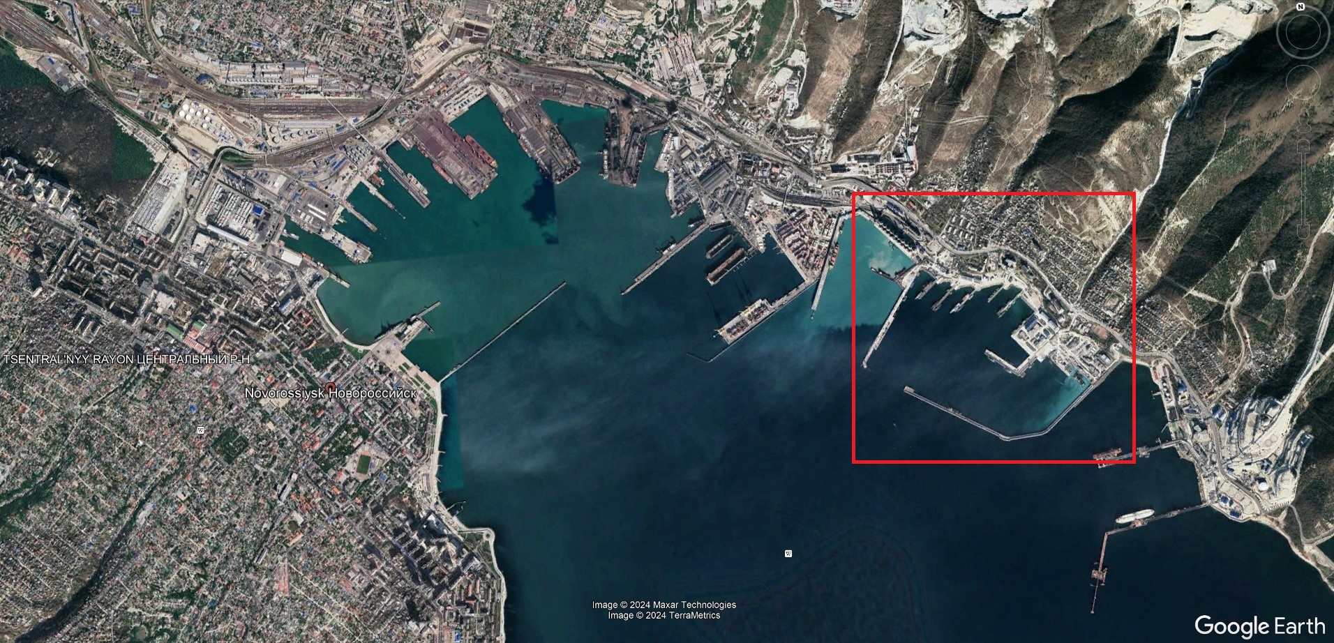 Novorossiysk is primarily an oil export port, with a small naval harbour (red).