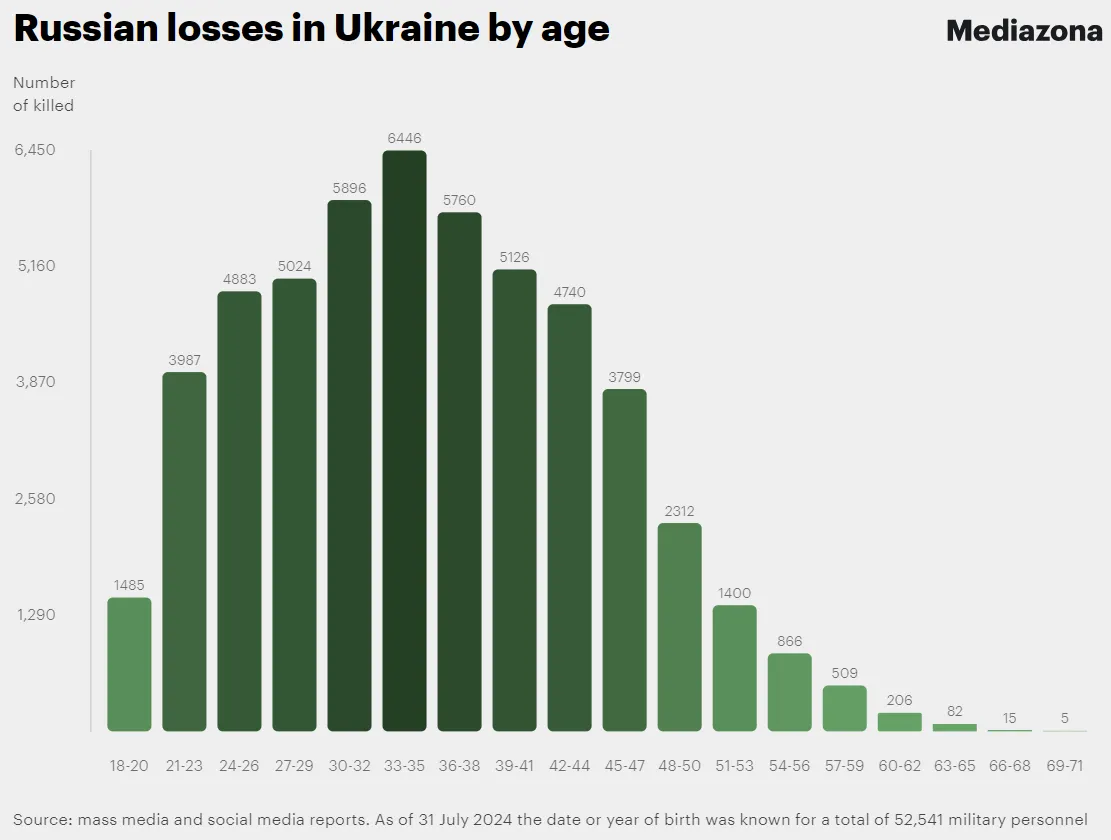 “When Russian forces make gains in Eastern Ukraine, these successes are often attributed to factors such as numerical advantage in vehicles, artillery, and manpower, along with a stronger recruitment situation in Russia compared to Ukraine. This creates the perception that Ukraine is uniquely struggling with manpower shortages and that Russia has a seemingly endless pool of manpower reserves. However, our recent research uncovers growing recruitment challenges in Russia, affecting both the quantity and quality of recruits. Our findings indicate that the average age of Russians killed in Ukraine is approaching 38 and continues to rise. This might have serious implications on the battlefield and the course of war, which we are discussing in today’s report.”
