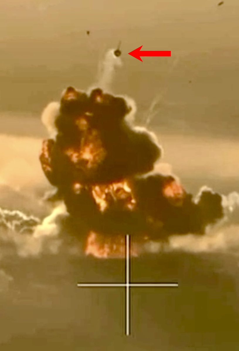 Donetsk Oblast, a Russian T-72 sends its turret roughly 250 feet (76m) into the air after a catastrophic ammunition detonation.