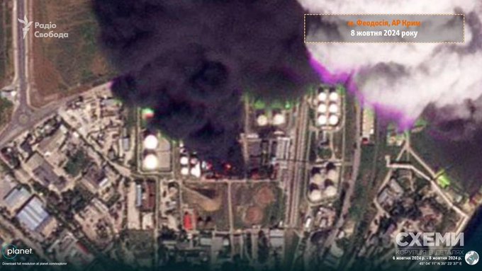 “First @planet satellite image showing the aftermath of the Ukrainian [missile or drone] strike on the Feodosia port oil depot, taken today, Oct. 8. As you can see, the ‘Pantsir’ system remains intact, despite being located right next to one of the burning fuel tanks”
