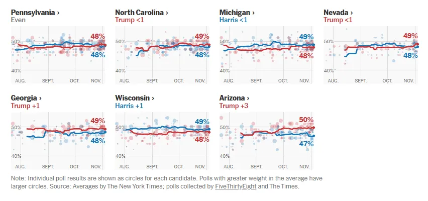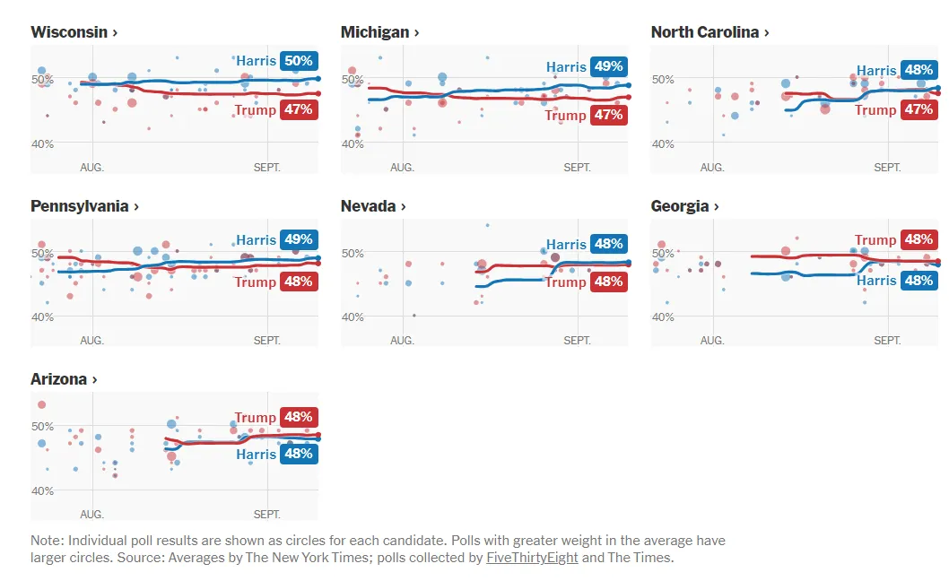 Back in September, based on the aggregate polls, Kamala enjoyed slim leads in the majority of swing states – Wisconsin, Michigan, North Carolina, and Pennsylvania – and was essentially tied with Trump in Nevada, Georgia, and Arizona.