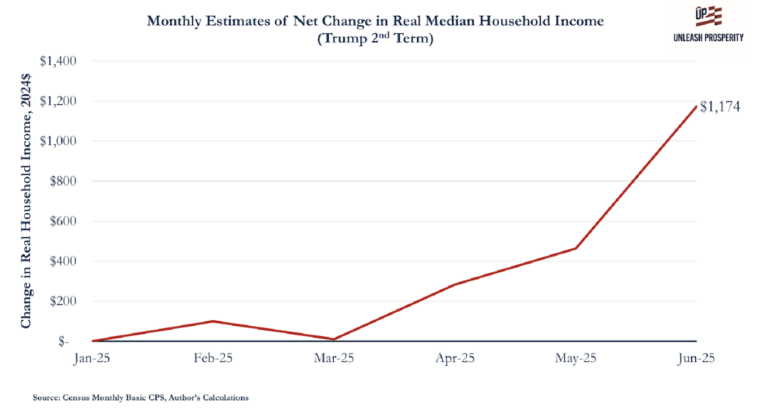 We’re hearing it everyday that Americans are facing an affordability crisis. Housing, tuition, health care, and grocery prices are rising fast. But over the first six months of Trump’s second term, affordability has gone up, not down. Through June inflation adjusted median household incomes are up about $1,100 per household.