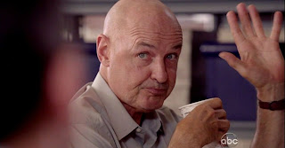 Locke's "I'm listenin'" was Kleenex grab moment #1, and realizing that I was staring at Really Old Roger and his son who cared dearly for him was Kleenex grab moment #2. I'm sure you all caught the irony of Ben helping to keep his father comfortable/alive by changing out his oxygen tank, whereas on the Island he killed him with poisonous gas. Even though I was all quivery-lipped during this segment, I didn't miss the huge piece of info that Roger doled out: namely, that they DID go to the Island and had been in Dharma for a bit before leaving.