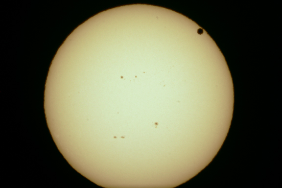 Explanation: Today Venus moves in front of the Sun. One way to follow this rare event is to actively reload the above live image of the Sun during the right time interval and look for an unusual circular dark dot. The smaller sprawling dark areas are sunspots. The circular dot is the planet Venus. The dark dot will only appear during a few very specific hours, from about 22:10 on 2012 June 5 through 4:50 2012 June 6, Universal Time. This transit is the rarest type of solar eclipse known -- much more rare than an eclipse of the Sun by the Moon or even by the planet Mercury. In fact, the next transit of Venus across the Sun will be in 2117. Anyone with a clear view of the Sun can go outside and carefully view the transit for themselves by projecting sunlight through a hole in a card onto a wall. Because this Venus transit is so unusual and visible from so much of the Earth, it is expected to be one of the more photographed celestial events in history. The above live image on the Sun is being taken by the Earth-orbiting Solar Dynamics Observatory and can be updated about every 15 minutes.
