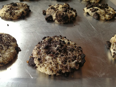 5. Pour Oreo crumbles into a bowl, Scoop dough out and roll into 1.5 in balls, then roll in cookie crumbes thoroughly. Be sure to cover the dough balls well in crumbs as this holds cookie together while baking.