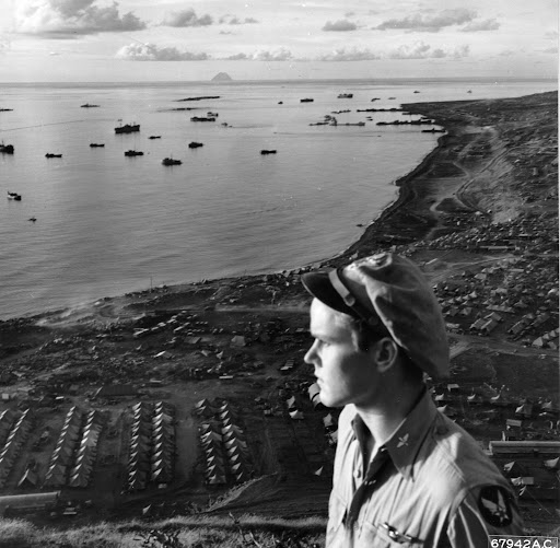 45th FS - Lt. Ceil Dennis, atop Mount Suribachi on a July evening in 1945, looks out over the 21st Bomber Command installations and the ships anchored near the shore of Iwo Jima, Bonin Islands.