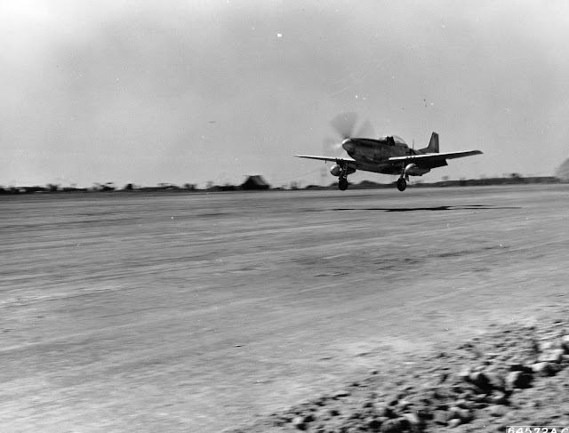 One of the first planes to arrive at Iwo Jima, Bonin Islands - North American P-51 "Mustang" - comes in for a landing on the airstrip. 6 March 1945
