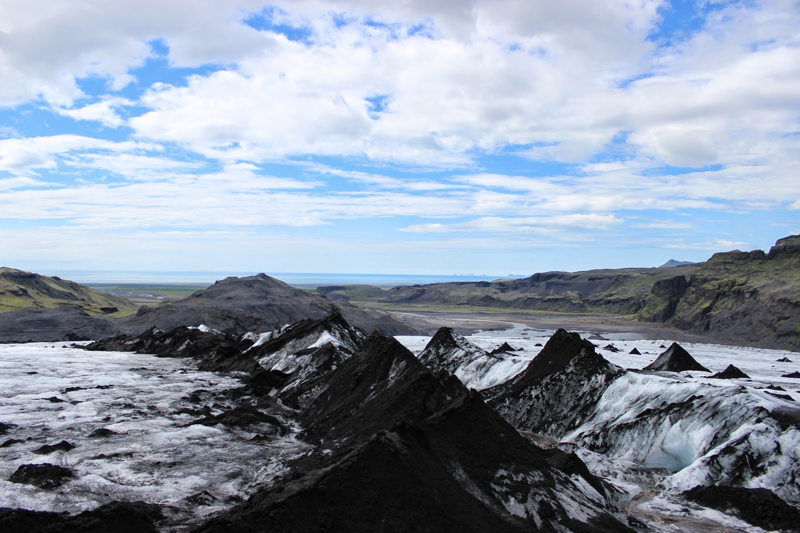 We saw a lot of these black ice cones. Apparently the debris from the volcano serves to insulate the ice, so the ice under the dirt melts last (resulting in the cones). Our guide also told us that the early settlers to Iceland were afraid to come up onto the glaciers, because they were convinced these were trolls. I believe it.