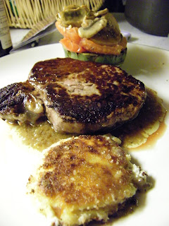 The restaurant served a medium rare filet mignon, perfectly cooked in white wine, atop a rich Bordelaise Sauce nestled w/ a lightly fried blue cheese patty; side of sauteed artichoke bottom stuffed with stewed fresh tomatoes and creamed mushrooms.