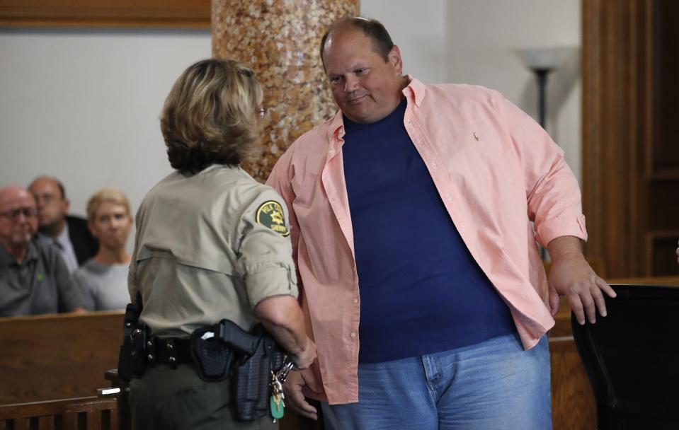 Former lottery computer programmer Eddie Tipton, right, is taken into custody after his sentencing hearing, Tuesday, Aug. 22, 2017, at the Polk County Courthouse in Des Moines, Iowa. Judge Brad McCall sentenced Tipton to up to 25 years in prison for rigging a computer program to enable him to pick winning numbers in several lottery games over six years. (AP Photo/Charlie Neibergall)