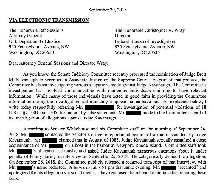 Grassley makes a criminal referral to the FBI. Cmte says someone made "apparent false statements to committee investigators alleging misconduct by Judge Brett Kavanaugh." Cmte says it's "not been able to substantiate any allegations of wrongdoing by Judge Kavanaugh."