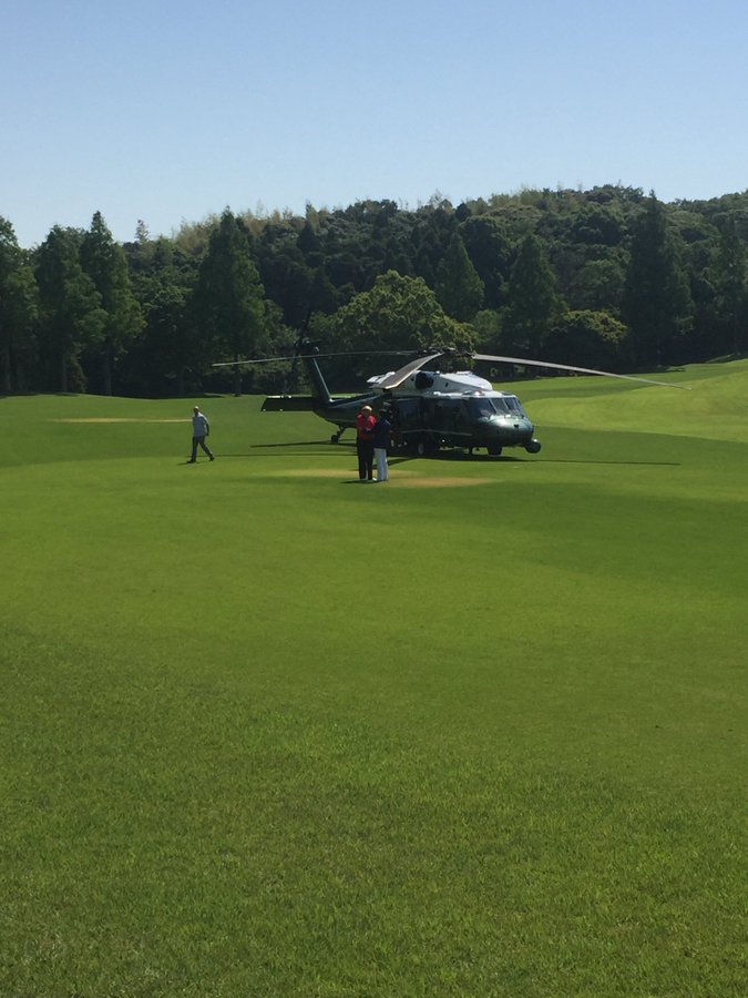 POTUS boarded Marine One before pool was able to get out of vans. He is bound for the Mobara Country Club Landing Zone in Chiba, and lifted at 8:25 am.