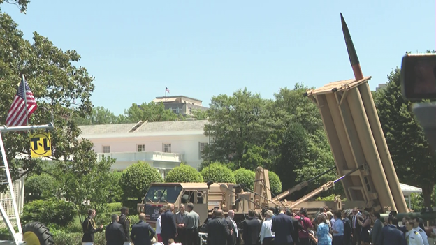 Pres sits behind the wheel of a Lockheed-Martin THAAD Anti-Ballistic Missile System. CEO Marillyn Hewson doesn’t seem to mind.
