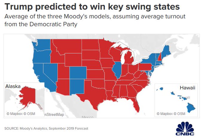 Trump could easily win re-election in 2020, according to modeling by Moodys Analytics. The Moodys models have been highly accurate, missing only once since the 1980 election. https://t.co/0j1HOLMLm3— CNBC (@CNBC) October 15, 2019