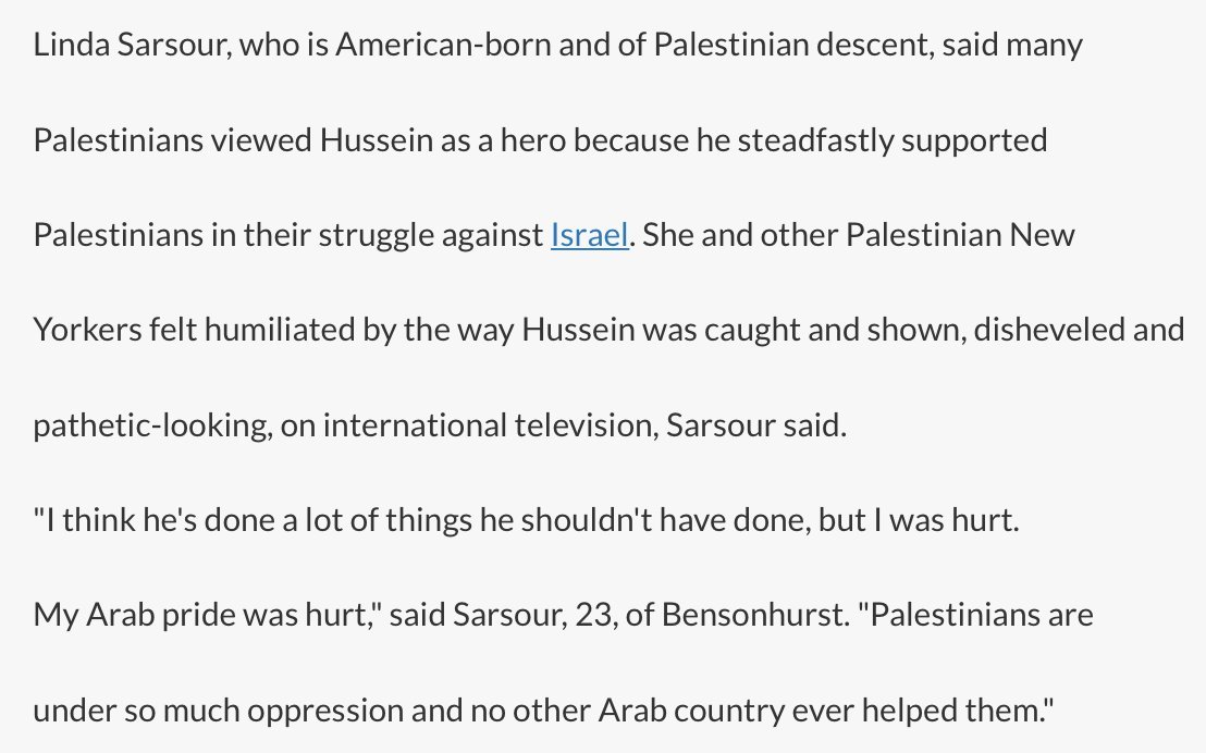 Not HER personally, but "other Palestinian New Yorkers felt humiliated by the way Hussein was caught".