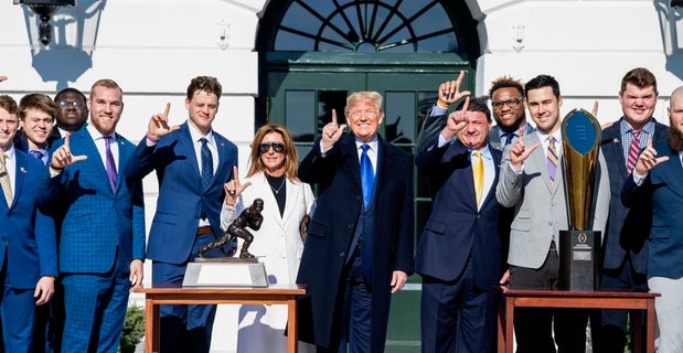 Pres Trump presented with LSU Team jerseys by QB Joe Burrow and the invites the team to Oval Office for photo session (1/17/20)