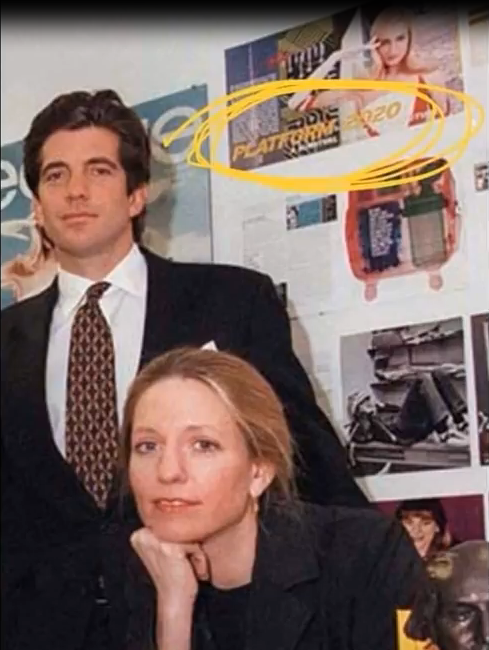 The white letters on the wall [from a 1997 'George' article] say in part: "Survival Guide to the Future": 'Buckle your chin strap and hold on as 'George' enters a time warp and RE-EMERGES IN 2020'.