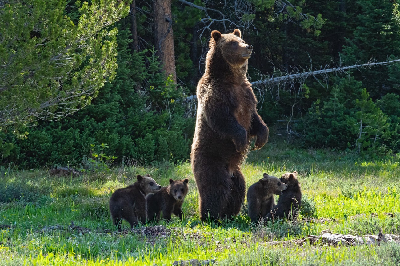 Grizzly 399 stands to get a better look at the growing crowd of bear watchers while her four cubs play. Photograph: Thomas D Mangelsen/mangelsen.com