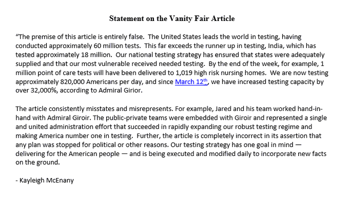 Our statement on the completely false Vanity Fair story. Senior Advisor Jared Kushner & Admiral Brett Giroir have done remarkable work on testing.