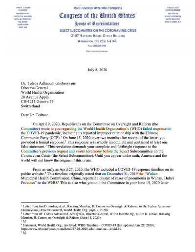 "Until you appear under oath, America and the world will not know the origins of this crisis."@SteveScalise, @RepJamesComer, @Jim_Jordan, @RepBlaine, @RepWalorski and @RepMarkGreen demand answers on false China info WHO gave to Congress.