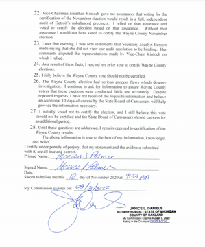 Added Palmer in her affidavit: “I rescind my prior vote to certify Wayne County elections.”