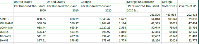 There are 412,794 Unique Last Names in Georgia... Drum Rolle 214,711 of those Last Names only have 1 Person Associated with it... No other brothers, siblings, sisters, parents, etc... Just 1 person.. Please click on chart I created. It gets better. The Top 6 names in GA are— BobbyPiton (@BobbyPiton3) December 25, 2020