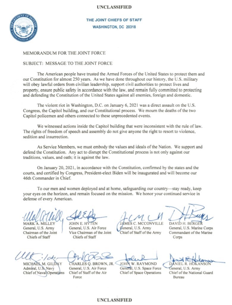 PDF of the letter at this tweet.NEW: The Joint Chiefs of Staff have sent this letter to the U.S. military about the attack on the U.S. Capitol, and the forthcoming transition of power to President-elect Biden as "our 46th Commander in Chief." pic.twitter.com/cbUFJ2Xgqi— NBC News (@NBCNews) January 12, 2021